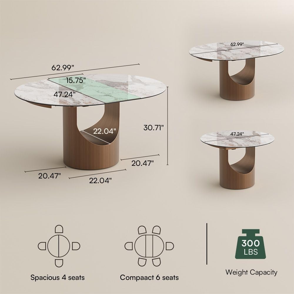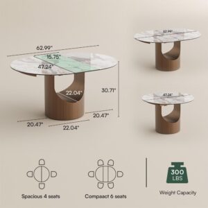 • 【Flexible Size for 4-6 People】 This versatile dining table features an innovative extendable design, effortlessly transforming from a 47″ round table for intimate family meals into a 63″ oval table for entertaining guests. Whether it’s a cozy breakfast or a festive dinner party, it comfortably accommodates 4 to 6 people, making it a perfect center-piece for modern homes