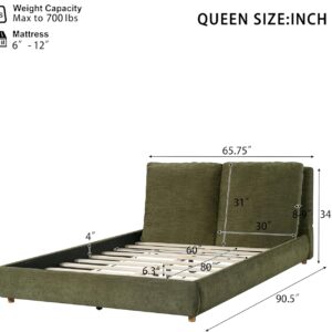 Queen Size Fabric Upholstered Platform Bed with Two Removable Pillow Headboard, Wood Bed Frame with Solid Round Legs for Kids Teens Adults, Olive Green